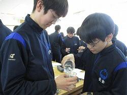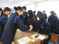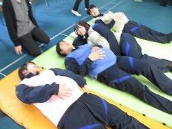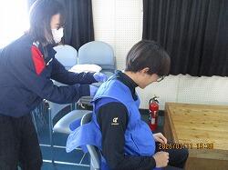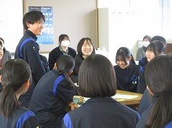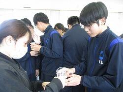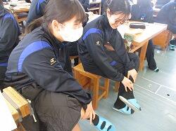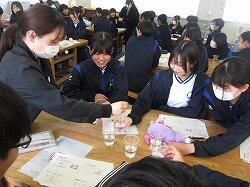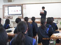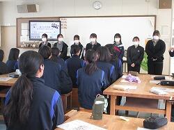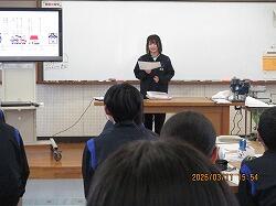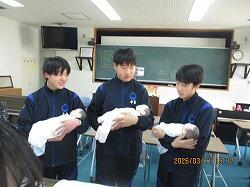 3月11日(水)6・7時間目に、3年生は、1・2年から継続して学んできた性教育の最後として「思春期ピアカウンセリング」を受けました。生徒たちは体操服・ジャージに着替え、会場である技術室に移動しました。この日、講師としておいでくださったのは、宮崎県立看護大学助産別科の学生の方々7名と神園先生、蚊口先生のお二人の先生方です。最初に、1時間の講話がありました。思春期のこころとからだの発達の特徴から、妊娠や性感染症、SNSでの情報に至るまで、動画や体験を交えながらわかりやすく話してくださいました。特に、感染症の広がりについてのコップと水を使った実験では、生徒たちが驚きの声を上げていました。休憩をはさんで次の時間には、6~7人のグループが、3箇所に分かれ体験学習です。妊婦体験、赤ちゃんのお世話、腹部触診、人生設計の四つの内容を順番に体験していきました。妊婦体験ではそれぞれが妊婦の疑似体験できる用具を体につけて寝転んだり起き上がったりして、「重い!」という声があちこちから聞こえました。赤ちゃんのお世話では、気を付けるポイントを教えていただきながら、人形の赤ちゃんをなかなか上手に抱き上げていました。腹部触診では、妊婦さんのお腹を模した用具を実際に触りました。人生設計は、自分の人生を年齢ごとに何をしているか、どうありたいか、それぞれが考えました。講話・体験を通してどの場面でも、相手のことを知り、思い、考える、ということが大切だと伝わってきました。生徒たちはしっかりと講話を聴き、体験では講師の先生方や生徒同士会話を交わしながら笑顔で授業に臨んでいました。大変すばらしい学びを得ることができました。最後に、生徒を代表して弓削海翔さんがお礼の言葉を述べました。貴重な機会を提供くださいました宮崎県立看護大学助産別科の先生方・学生の方々、本当にありがとうございました。