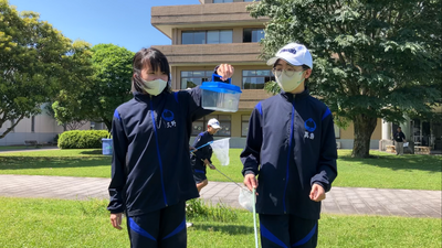 5月16日(木)午後、2年生は今年度初の校外学習「大学探訪」で南九州大学を訪れ、さまざまな学びを経験させて頂きました。毎年、南九州大学の手厚いご協力を得て、充実した大学探訪ができています。昼食後、タクシーに分乗して南九州大学に到着した2年生。今年度は、昨年度に引き続き、環境園芸学部の中野光議先生に講義をしていただきました。水生生物や陸上生物についてお話を聞き、それからふた班に分かれて、水辺ビオトープやヒーリングガーデンでそれぞれに生物の調査を行いました。採集用の網を使って、陸上では蝶や蛾、バッタ、芋虫などを、水中ではメダカやおたまじゃくし、ヤゴ、貝などを捕獲し観察しました。子ども達は非常に楽しそうで、どじょうなど珍しい生物が捕れると歓声があがり、互いに捕獲した生物を見せ合っていました。外遊びが少なくなった現代、こういう体験が初めての生徒もいたようですが、子ども達は貴重な体験ができたと嬉しそうに話していました。観察後は捕獲した生物を自然に返し、2年生を代表して井上結月さんが御礼の言葉を述べました。