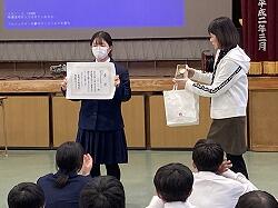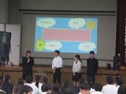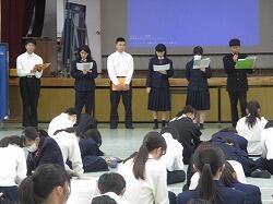 11月22日(木)7時間目に、義友会館で清泉会集会が行われました。これは、11月19日(火)に行われた中央清泉会を受けて行われ、前旬間の振り返りと、次の旬間に向けての目標の確認と具体的対策を、各専門委員会から発表・確認しました。以前はプレゼンテーションで示して発表していましたが、現在は発表内容のプリントを生徒一人一人が手元に持ち、メモを取りながら聞く形になっています。これまでがどうだったか、そしてこれから何に取り組んでいくのか、しっかりと確認できます。また、今回は、10月末に取り組んだ福祉体験学習の報告もありました。1年生は9月から約一ヶ月半取り組んできた福祉体験学習、3年生は保育園・こども園訪問について発表しました。1年生は、高齢者福祉や障がい者福祉について、出前授業やオンライン授業を通して学んできたこと全般を分かりやすく発表しました。3年生はプレゼンテーションや保育園児の服装を用意して再現劇や・「ひげじいさん」の歌を交えながら、楽しく分かりやすく発表していました。どちらも充実した体験学習ができたことが伝わってきました。さらに、夏休みに行われた中学生拉致問題サミットに本県代表として参加した2年生の後藤稟子さんが、そのとき学んだことをみんなに伝えたいと報告をしてくれました。未だ解決していない大きな問題について、詳しく知ることができました。清泉会全体も、さまざまな面でよりよくなるよう、執行部を中心にいろいろな改革がなされながら進んでいます。よりよい泉附であるよう、よりよい学校生活ができるようみんなで考え進んでいきましょう。また、最後に、集会の場を借りて、英語の暗唱・弁論大会の表彰披露も行われました。