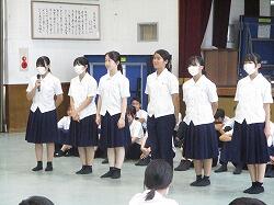 9月19日(木)7時間目に、地区中学校秋季体育大会に向けての壮行式が義友会館で行われました。2年生・1年生中心となった新チームでの初の中体連主催の大会となります。式では激励の言葉を清泉会会長の3年・平山笑里さんが述べました。次いで女子バドミントン部、女子バスケットボール部、男子バスケットボール部の順に、前に整列した選手が全員起立し、各キャプテン(安藤結貴さん・内田陽菜さん・大渡健慈さん)が決意の言葉を述べました(陸上競技に出場する齋藤誠志朗さんは教室で述べました)。そして、男子バスケットボールキャプテンの2年生・大渡健慈さんが堂々と決意を宣誓しました。教頭先生からは「ミスや失敗を恐れず挑戦してほしい」というお話がありました。さあ、いよいよ大会です。本校では23日(月)に開始される男女バスケットボール部が最初に大会に挑んでいくことになります。