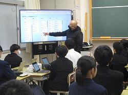 12月17日(火)2時間目に、1年A組で保健体育の支援訪問授業が行われました。本校にとって今年度最後の支援訪問授業、今回は保健の授業が教室で行われました。単元は「健康な生活と疾病の予防『調和の取れた生活』」。今回の授業は全体の3時間目で、この単元の最後の時間でした。授業では、それまでに調べてきた健康習慣に関する「食事」「運動」「休養・睡眠」「スマホの影響」という四つの分野の知識を、ワールドカフェ方式で新たなグループに分かれ、それぞれが発表者となってみんなで共有し、コメントも一覧できる形でどんどん入力し共有していました。それぞれが自分のこととして課題意識をもち、よりよい改善策とそれに向けての目標を設定しようと意欲的に臨んでいました。この授業でも、中学校職員だけでなく、保健体育科を中心とした高校の先生も参観されていました。