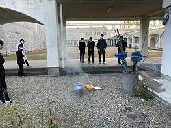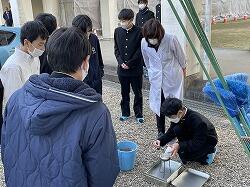 令和6年1月26日(金)の放課後、化学部の先輩方に実験を教えていただきました。今回は準備からサイエンス部員が活躍できる場を用意してくれていたので、みんな熱心に実験に取り組むことができました。テルミット反応という酸化還元反応の実験でした。燃焼する際の様子が面白いから、附属中生が興味をもってくれるのではないかと考えてくれていたようです。その意気込みを聞けただけでも、附属中生は感動していました。酸化鉄5gとアルミニウム2gを部長の附属中出身である大山先輩の手助けを借りながら、田中さんが丁寧に測りました。次に、重留さんが乳鉢で丁寧に混合し、長倉さんが、附属中出身の永野先輩と一緒にマグネシウムリボンを切りました。1回目の実験は思ったほど火の手があがらず、「なぜ?」かを検証したところ、濾紙を濡らしていないことが判明。すぐに、再挑戦。失敗を次の成功へと導くために考えるところが附属中生のいいところです。次は3000度の高温になり、酸化鉄を取り出すことがでるはずでしたが、取り出した小さな塊をハンマーでたたくと、粉々になってしまいました。残念ながら酸化鉄は取り出せませんでしたが、様々な反応が見られ、とても面白かったです。・・・結果、バケツに穴が開くということも驚きでした。実験後は、恒松さんが、「マグネシウムリボンを使った理由」を質問したり、とても有意義な時間となりました。ご協力いただいた、化学部のみなさん、鳥取先生、ありがとうございました。