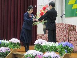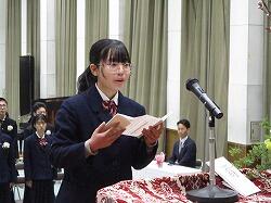 前日の天気予報では、「春の暖かさ」と耳にしていたのですが、朝の空気は冷たく、人気のない卒業式会場の義友会館はよりいっそう寒く感じました。1・2年生は、朝から前日準備した場所を再度確認するのに余念がありません。3月15日(金)は第12回卒業式。12期生40名が附属中から飛び立つ日です。9時前後、美しく整えられた会場に、1・2年生が入場してきました。ややいつもより静かな様子で、3年生にとって大事な「式」であるという意識があるのでしょう。校長先生をはじめとした先生方も着席し、3名の来賓の方をお迎えして、3年生の入場を待ちました。「卒業生、入場。」の声がかかると、幾分か緊張を湛えた表情の3年生が、担任の新地先生を先頭にゆっくり入場してきました。2年生の下沖由依さんが伴奏を務めて国歌斉唱。いよいよ卒業式の中核となる卒業証書授与を迎えました。40名という少ない人数ですので、一人一人壇上に上がり校長先生から名前を呼ばれ、証書を渡していただきます。十分練習を積んだのでしょう、所作も美しく、大変堂々とした態度で、これまでのそれぞれの3年間の成長を物語るように自信に溢れていました。校長先生は式辞で、これからの予想のつかない社会を生き抜いていくために大切なこととして、教育心理学者のベンジャミン・ブルームの思考の6段階を例に示されながら、①探究的学びを獲得していくこと ②失敗や挫折を恐れることなく果敢に挑戦していくこと の二つを話してくださいました。そして、「大きな子どもではなく、小さな大人であってほしい」との思いを伝えてくださいました。PTA会長の松山様は、特に情報通信の分野で進展の速い社会を生きていく生徒たちに、大谷翔平選手を例に挙げ、AIを上手に活用しながら適切に判断し、努力を惜しむことなく勇気をもって挑戦を続けていくことの大切さを祝辞として贈ってくださいました。記念品贈呈では、在校生代表の2年生・奥村知史さんから、卒業生代表の小河夕莉さんへ、目録が手渡されました。在校生代表の送辞は、2年生・平山笑里さん。伸びやかな美しい所作も相まって、今までずっとそばにいてくれた卒業生への思いが切々と伝わってきます。感謝の思いが最初から最後までぎっしり詰まった送辞に、卒業生全員が聴き入っていました。卒業生代表答辞は、江夏妃奈乃さん。コロナ禍で始まった学校生活の中で絆を深めた仲間・12期生。それは恵まれた環境、繰り返される日常の積み重ねがあってできたたことで、それがどれだけ特別なことか、と思い至ります。先生方、後輩たち、家族への感謝の思い、そして未来への挑戦の決意。落ち着いた声で切々と述べました。卒業生や保護者の中には涙する人も。卒業生の3年間の思い、これからへの思い、届きました。卒業式の歌は「どんなときも。」。指揮は西畑宗一郎さん、伴奏は大形ららさん。大変美しいハーモニーで心を打ちます。最後の校歌は2年生・石橋彩花さんが伴奏します。中学生が歌う校歌は合唱になっていて、大変美しい伸びやかな校歌を全員で歌うことができました。保護者代表謝辞の後、卒業生が退場します。入場したときと違って、少し紅潮した顔で、晴れやかに会場を後にしました。
