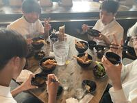 5月15日(水)、3年生修学旅行2日目、TGGで英語を使ってたくさんしゃべったり考えて楽しみながら学んだあとは、レストランで昼食をとりました。アクアシティ台場の眺めの良いレストランで、天丼、冷蕎麦、サラダ、冷奴、味噌汁という豪華なご飯。美味しくいただきました、食べたあとはテーブルごとに食器を重ね、きれいにととのえていました。