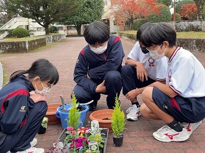 講話の後は、南九州大学の学生と一緒に、花の植栽を行いました。生徒は長江教授からお話しいただいたことを踏まえ、楽しく活動しつつも心を込めて花の植栽を行いました。