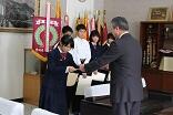 平成29年11月15日(水)に『「税についての作文」表彰式』が本校校長室で行われました。県内中学校から4716点の応募があり、本校からは3年生5名が優秀作品として選ばれ、都城税務署長の吉田芳浩様より一人一人に表彰状が授与されました。