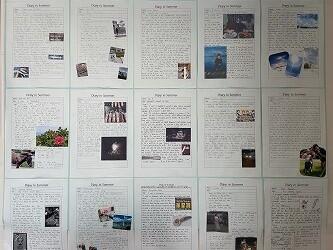9月9日。校内を歩いていると、2・3年生の「夏休みの思い出」の英作文が貼られていました。