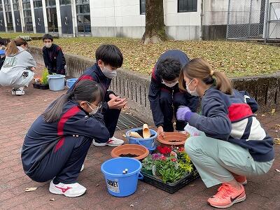 講話の後は、南九州大学の学生と一緒に、花の植栽を行いました。生徒は長江教授からお話しいただいたことを踏まえ、楽しく活動しつつも心を込めて花の植栽を行いました。