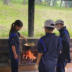 おこした火を大切に守りながら炊飯場でカレーを作ります。これも班の協力が欠かせません。お米を研いで薪に火をつけ飯盒で炊いていきます。カレーは野菜を切って肉を炒めて…おや、なかなか上手です。片付けも同時進行で進めるなど、たいへん手際がよい班が多いです。出来上がったカレーはなかなか美味。ご飯が柔らかめの班もありましたが、みんな美味しくいただきました。食べた後の片付けも、班や係をこえて、積極的に取り組んでいました。