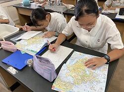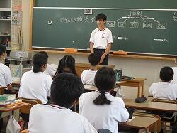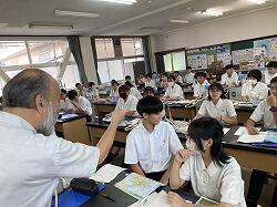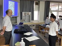 9月20日(水)5・6時間目に、2年生は総合的な学習の時間の自然科学探究で出前授業を受けました。今回のテーマは「火山について」です。講師としておいでくださったのは、宮崎大学教育学部・山北聡先生です。日本は火山がとても多く、それにより恵みを受けることもあるのですが、被害を受けることも往々にしてあります。授業では、最初に地図に火山の位置をかき込み、どれだけ多くの火山があるのか認識することから始まりました。日本や世界の火山の種類や、カルデラ、火砕流……。耳にするけれど詳しくは知らない言葉が次々と出てきます。意識して話を聞くと、日本という土地についてよく知ることができます。「死都日本」という本の紹介もあり、自分たちの暮らす日本の火山のことや地質のことに興味・関心をもつことができました。最後に生徒を代表して増田陽さんがお礼の言葉を述べました。お忙しい中、授業をしてくださった山北先生、派遣くださいました宮崎大学に心からお礼申し上げます。ありがとうございました。