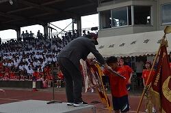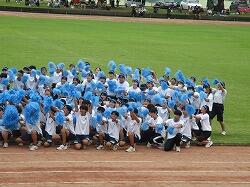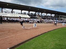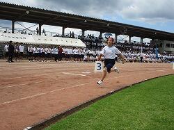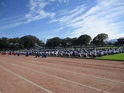 朝から見上げる空。雲は多いですが、青空が覗いていました。9月6日(水)、2日遅れにはなりましたが、「都泉祭・体育の部」が晴れやかに市営陸上競技場で実施されました。開会式の選手宣誓では、赤白青三つの団の団長が団旗を背に、最高の体育の部にしよう、と決意の言葉を述べました。競技の最初を飾るのは、中学生によるアトラクションです。3年生ダンス委員を中心に、一生懸命練習に取り組んできました。「おとわっか」「VERY NICE」「アイドル」の曲に合わせて中学生全員の力を合わせて競技のスタートを華やかに盛り上げました。続いての中学生の登場は、中学生全員によるリレーです。各団2チーム、学年を取り払って作戦を立ててバトンを繋いでいきます。一人50メートルを激走する中学生たち。高校生の先輩方の応援を受け、頑張りました。見事、赤団が1位でゴールしました。午前中三つ目の出場は、中学生団技「台風の目」です。横に渡した棒を4人で運び、途中のコーンを回って持ち帰り、待機している生徒たちの下をくぐらせてバトンタッチ。途中バランスを崩してやりなおしをしたり、待機生徒のジャンプのタイミングが合わなかったりと、いろんな出来事が起こりますが、みんなで力を合わせて乗り越え、三つの団とも無事ゴールできました。最後に逆転して青団が勝利を得ました。高校生の先輩方の応援が力になりました。そして、お昼。数年ぶりに保護者にも来ていただいての都泉祭ですので、陸上球技場の周辺では家族でお弁当を囲んでくつろぐ姿も多く見られました。午後の最初は、長く練習を重ねてきた各団によるアトラクションが行われました。中高生全員が出場しますので、見応え十分。白・赤・青の順番に実施されました。各団、曲に合わせて隊形を変えながらフィールドを上手く使って多人数ならではの演技を披露します。どの団も、すばらしい出来上がりでした。会場中から大きな拍手が贈られました。中学生最後の出場は団対抗リレーです。赤団・隅夏波さん、大渡健慈さん、青山桜咲さん、新増淳さん、井阪菜々子さん、重留啓秀さん、白団・後藤稟子さん、弓削海翔さん、柳田桜子さん、山崎真侍さん、山元紗羽さん、冨吉創太さん、青団・萬壽瑛那さん、重留悠吾さん、佐澤和奏さん、中原唯正さん、小河夕莉さん、山口大輝さんが代表として出場。団対抗リレーは、中学生がスタートですのでいっそう力が入ります。中高全員が見守る中、大きな声援を受け、力走しました。閉会式。優勝、応援の部優勝、共に赤団と結果は決まりましたが、いちばんすばらしいことは、この日までの過程を含めて全員が頑張り抜いたことではないでしょうか。夏休み明け、そして毎日の猛暑、熱中症・感染症対策……。困難はあっても、工夫と知恵と努力で、みんなで頑張りました。都泉祭3日間は無事終了しました。全員に大きな拍手を送りたいと思います。そして、都泉祭開けの日々も、この期間で得た己が成長を、ぜひ活かしてほしいと思います。この3日間、ご観覧くださいました保護者の皆様、ご家庭で応援くださいました保護者の皆様、本当にありがとうございました。