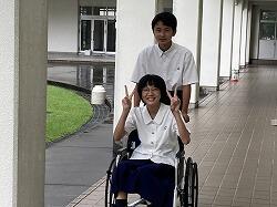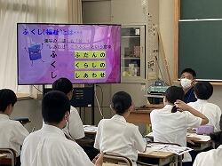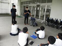 9月13日(水)6・7時間目、1年生ではこの日から「福祉教育体験活動」がスタートしました。本校では、1年生と3年生で福祉学習に取り組みます。特に、1年生ではこの日を皮切りに8回に渡って福祉について学んでいきます。13日は、「福祉講話・車椅子体験」で、都城市社会福祉協議会の川﨑様・橋本様、ウエルライフの日高様・南崎様に講師としておいでいただき、20名ずつのふたつのグループに分かれて、学習しました。「福祉講話」では、「『ふくし』ってなんだろう」という基本的な考え方から入り、福祉にはいろいろな分野があること、身のまわりにはいろいろな人がいること、すべての人が毎日安心して幸せな気持ちで過ごせるようにすること、といったことを順序立てて分かりやすく学んでいきました。特に高齢になると起こる変化については、体だけではなく心の面も配慮していく必要があることは、これからの福祉の学習に役立つ学びとなりました。「車椅子体験」では、車椅子の使い方や使う際に注意することの説明を受けた後、二人組になって双方が乗り手と押し手となり、車椅子の準備、乗り降り、段差や坂の上り方下り方などを実体験しました。校内でルートを決めて体験していきましたが、想像していたより大変だった、段差に苦労したといった声が聞かれました。ちょうど、この日の道徳の時間にも「福祉」をテーマとした学習をしていた1年生たちは、お話や体験を通して、より福祉学習への意識が高まったことと思います。