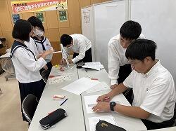 11月10日(日)、宮崎県教育研修センターで行われた「令和6年MSEC度理数系生徒探究活動講座」に、科学の甲子園ジュニア全国大会に出場予定の、本校2年生、重留悠吾さん、田中史恩さん、平峯楓士さんの3名、小松原中学校の3名の計6名が、多くの高校生と一緒に参加しました。さまざまな高校の探究活動の発表など行われ、大変勉強になりました。その中で行われたコンテスト形式の「マニュファクチャリング」(ものづくり)に参加した科学の甲子園ジュニア出場チーム。A3ケント紙3枚を使い、5秒間倒れないものを決められた時間内に作り高さを競うのです。ケント紙を使って高く高くタワーを作ったジュニアチーム、制限時間内に、椅子に乗らないと計りきれないくらい高いタワーを作りました。カウント5秒間キープでき、全高校生チームを相手に見事1位を勝ち取りました!頼もしい理数科ジュニアが育っています。