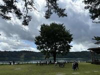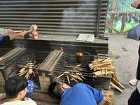 火おこしの火を持って、炊飯場へ向かい野外炊飯をしました。今夜のメニューはカレーライスです。雨が断続的に降る中、用意された薪が湿り、火を大きくするのに苦労した班が多かったようです。最終的にはみんな美味しく頂くことができました。中高生が和気藹々と調理したり食事したりする姿がとても微笑ましく、新鮮に感じました。
