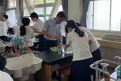実験を始める前に、個人で予想を立てて、ペアで検討した後、実験を行っていました。理科の先生に話を聞いてみると、2人実験は理数系に力を入れている本校ならではのシステムで、高校も担当されている実験助手の先生がいらっしゃるからこそ実現できているのだそうです。