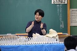 6月12日(水)6・7時間目の1年生の総合的な学習の時間に出前授業が行われました。題して「宮崎の海から『進化』と『環境』を考える~日向灘のイルカ・クジラ・ウミガメ」。講師を務めてくださったのは、宮崎大学教育学部・西田伸先生です。新しい出会いに目を輝かせて向き合う1年生。今回の出前授業でも、理科室に入った途端、目をきらきらさせて机の上に並べられた動物の骨に注目!授業への期待が膨らみます。私たちが暮らす宮崎は海と深い繋がりがあります。海に打ち上げられる動物たちも多くあり、そのたびに西田先生は調査されていらっしゃいます。動物の骨は多くを語ります。「進化」も「環境」も骨から分かってくるのです。授業ではお話の合間に、生徒たちに実際に動物の骨などを触らせてくださり、みんな興味津々で見入っていました。最後に、生徒を代表して天神煌士郎さんがお礼の言葉を述べました。お忙しい中、楽しい興味深い授業をしていただいた西田先生、派遣くださいました宮崎大学に心からお礼申し上げます。ありがとうございました。