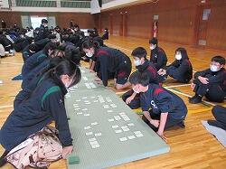 第3回定期テスト終了後から、各学級本格的に百人一首大会に向けての練習を始め、学級対抗戦や文化清泉会主催の朝のファミリー練習、放課後の自主練習などを経て、12月22日(月)午後、校内百人一首大会が開かれました。昼食を済ませジャージに着替えて体育館に集合しました。体育館では、午前中に高校生の3クラスが会場準備をしてくれました。感謝です。用意してくれた畳の前にみんなで整列し、開会行事が行われました。そして、早速、第1試合が行われました。中学生も、あちらこちらで高校生と対戦しました。第1試合が終わり、少しの休憩をはさんで第2試合。今度は中学生同士の対戦も数か所ありました。試合は第3試合まであり、チームごとの勝敗数が最優先で判定されていきます。ですから、どの対戦も真剣そのもの。2勝2敗であと一人が勝つか負けるかで勝敗が決まる、というときなど、みんな固唾を飲んで見守り、チームで一喜一憂。三試合が終わり、片付けをしていよいよ結果発表。3年生の長倉史拓さんが結果を報告しました。6位まで表彰があり、見事、3年A組が優勝、2年A組が4位という結果に輝きました。おめでとうございます!!また、1年生も、わずか1か月の短い期間で、驚くほど腕を上げています。来年度がとても楽しみです。朝の練習、放課後練習など、百人一首大会に向けて、真剣にそして楽しみながら盛り上げてきた、附属中の生徒たち全員に大きな拍手を贈りたいと思います。