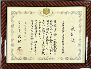 授与された感謝状は、本校2階の渡り廊下の棚に並べています。本校における栄光の軌跡が追加されたことをうれしく思います。