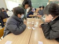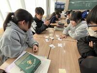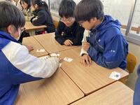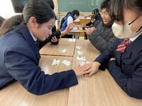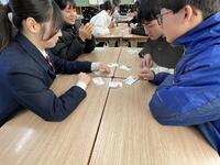 令和7年12月18日(木)の英語(Cタイム)の時間「Hyakunin-Isshu in English」と題して、英語での百人一首に挑戦しました。この時期は、附属中生全員が百人一首に夢中になっています。その集中力と好奇心を最大限に活用し、英語での百人一首に取り組みました。2Aの生徒の中には、ローマ字百人一首と勘違いしている生徒もいましたが、日本語の短歌を英訳したものが「かるた」として発売されており、そのカードを使ってグループで活動しました。学習していない単語もあり、読み手の生徒は苦戦しているようでしたが、上の句の英語を聞いて、創造力や関連ワードを結び付けながら、カード取りに熱中していました。例えば、「“The flowers withered, Their color faded away・・・」と出てくれば、「花の色はうつりにけりな・・・」と生徒たちが反応してくれます。国語の時間にしっかりと百人一首を学習しているからこそ、瞬時に反応できる力だと思います。リスニング力も同時に鍛えられる活動となりました。