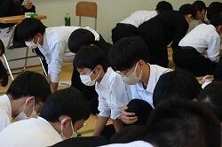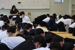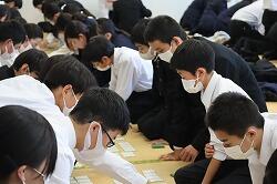 12月18日(木)7時間目。12日(金)の合同練習に続く第二弾、1年生VS2年生の百人一首合同練習いずみ会館で行われました。大会がかなり近づいてきて、各学級、朝自主的に行ったり、放課後練習に参加したり、部活動が終わってから放課後練習に少しでも参加したりと、それぞれよく頑張っています。初心者だった1年生たちも、少しずつ実力をつけてきています。この時間、1年生VS2年生で集中した対戦が繰り広げられました。