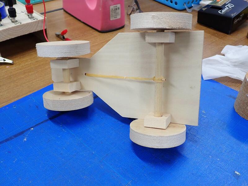 ゴムを車軸で巻き取り、手を離すと前に進みます。今回は車輪などすべて