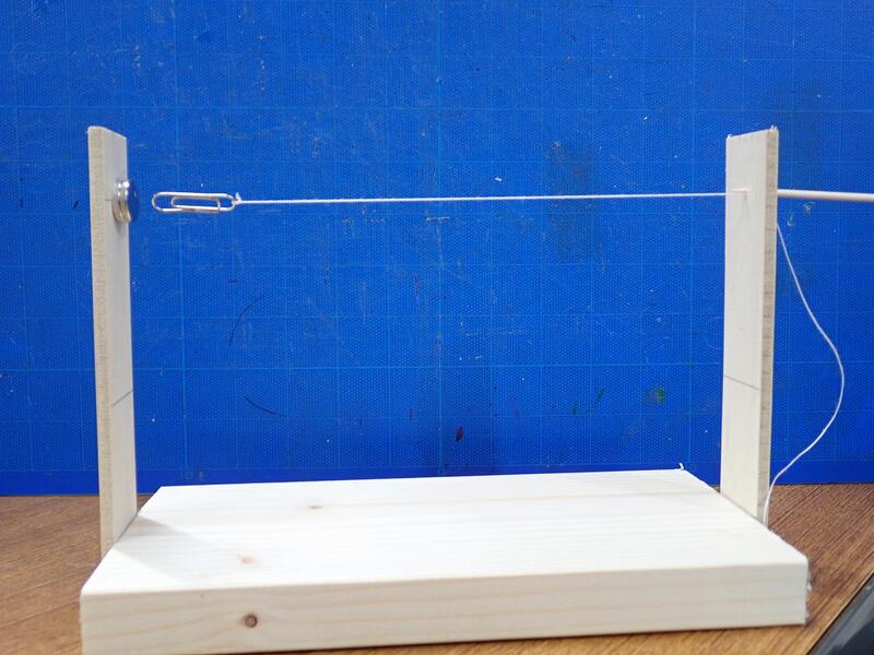 強力磁石で糸をつけたゼムクリップを空中に浮かせた実験器具です。