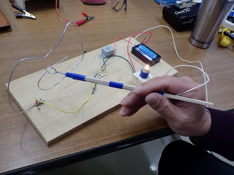 曲げた金属線に金属線の輪を触れないように通す電気のおもちゃ