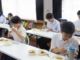 〇2年生が牛丼とコンソメスープの調理実習を行いました。野菜を切ったり、材料をいためたり、手際よく上手に仕上げました。実食ではとてもおいしく、笑顔があふれていました。この経験が今後活かされることでしょう。
