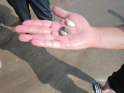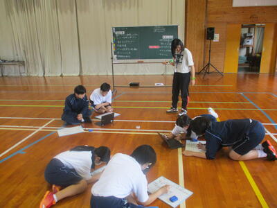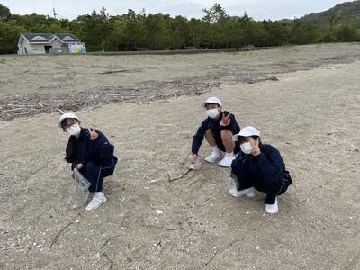 〇生徒会主催の歓迎行事を行いました。対面式の後、〇✕クイズ・絵描き伝言・ジェスチャーゲームをグループに分かれて行いました。その後、熊野江海岸に移動し貝殻ストラップ用の貝拾いをしました。貝殻ストラップ用の貝を探すのに苦労していましたが、お互いの交流を広めながら楽しそうに集めていました。生徒会の計画もよく、生徒主体の活動の素晴らしさを感じました