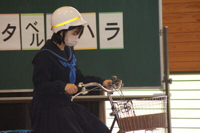 〇延岡警察署と延岡市交通安全協会の方を講師に招き、熊野江小・南浦中合同で、交通安全教室を行いました。講師の方から交通安全についての注意事項やヘルメット着用の重要性などの講話があり、全員しっかりと確認しながら聞いていました。その後実際に自転車での注意事項を具体的に学びました。特に内輪差について、気をつけることが印象に残ったようです。