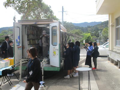 〇ふくろう号が中学校に到着しました。小学生・本校生徒・職員も興味のある本をじっくり見ていました。多種多様な本を見ながら、数冊借りている生徒もいました。読書は「多くの知識を得ると同時に、心にゆとりを与えることがある」と聞いたことがあります。どんな本を読むのでしょうか?