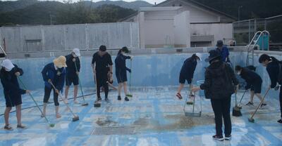 〇昨日から小雨、当日は実施できるか心配でしたが、生徒たちの実施への願いが届いたのか天気も良くなりました。生徒・職員は熱中症に気をつけながら(休息・水分補給等)楽しく行いました。小学生も小プールを一所懸命に清掃をしていました。要領よく清掃を行ったおかげで、昨年より時間も短く終えることができました。今後の保健体育(水泳)授業が楽しみです。