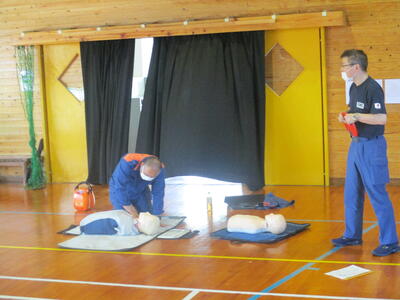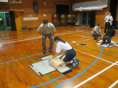 〇延岡市消防署警防課警防係の方を講師に招き、浦城小学校・熊野江小学校・南浦中学校3校合同で、「救急救命法」の職員研修を行いました。心肺蘇やAEDの使用方法を細かく確認しながらの研修でした。各先生方は、「救命のリレー」(それぞれの場面で担当者が役割を引き継ぐ)「救命の連鎖」(命を救い、社会復帰に導くために必要な一連の手順)を熱心に学び、心肺蘇生では、様々な場面での状況確認及び留意事項等について繰り返し確認しました。