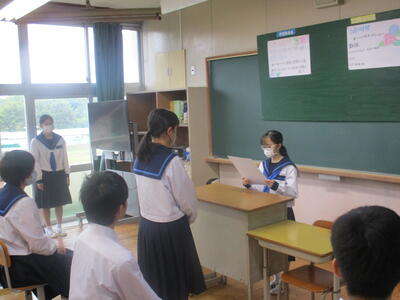 〇今月の各専門委員会活動の共有化を図り、学校全体で取り組むことの確認を行いました。学習委員会では、「テストに向けて振り返ろう」生活保体委員会は、「歯と口の健康に気をつけよう」の目標に、具体的な取組が示されました。その後、生徒会が人選し、月毎に張った生徒を表彰する「MOM(Man of the minamiuru)」の表彰がありました。表彰を受けた生徒は「みんなのおかげです。今後も頑張ります」とお礼の言葉を述べていました。大変素晴らしい言葉だと感心しました。