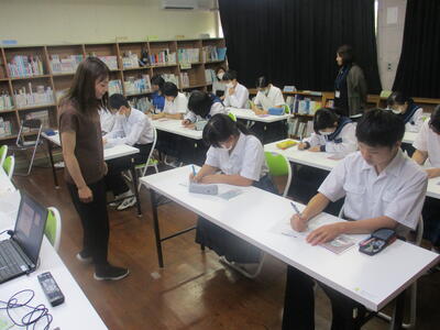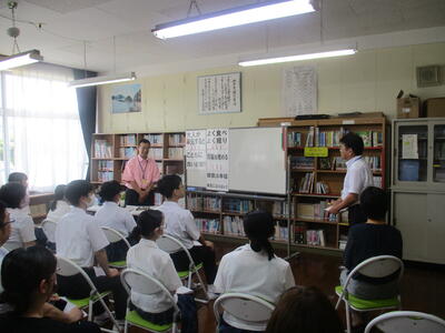 〇延岡大空襲の日。10時に黙祷を行いました。また、夕刊デイリー記者の坂本光三郎さんを講師に招き、「平和学習」も行いました。延岡で実際に起きた出来事や、当時の写真や映像など多くの資料を見せていただきながら、講話を行っていただきました。生徒たちは真剣に聞き、「平和な社会を築くため必要なこと」を考えていました。一人一人が自分にできることを考え、実行して行くことの大切さをあらためて感じたようでした。