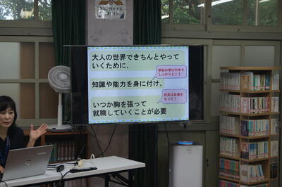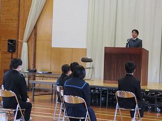〇ふるさと教育推進事業「子どもたちに伝えたいこと」を行いました。宮崎キャリアサポートセンターの細川真由美さんを講師として招き、「マナーアップ講座~職場体験学習に向けて~」という題名で、これからの生き方や考え方、働くことの意義などについてわかりやすく講話されました。特に、職場体験で学んで欲しいことや、マナーについて具体的に学ぶことができたようです。講話後に、生徒代表のお礼の言葉を述べ、貝殻ストラップをプレゼントしました。講師の方が「聞く態度もとてもよく、お土産までいただいて、大変うれしいです」と言われていました。職場体験でも多くのことを学んできてくれることでしょう。