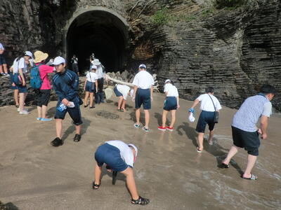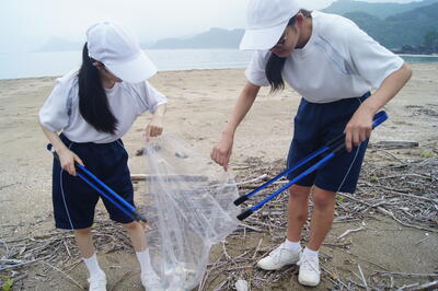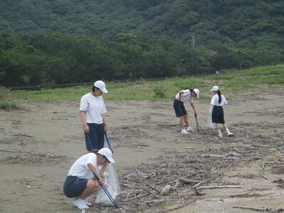 〇6月30日に小学校・地域の方と合同で実施する熊野江海岸清掃が中止になりましたが、本校は独自に7月7日に、「熊野江海岸クリーン作戦」として、実施しました。生徒は、流木の間の、小さなゴミまで念入りに拾いながら、海岸を清掃しました。海岸を見ながら、「きれいになった海岸はいいです」と生徒が話をしてくれました。自然の美しさと、それを保とうとする気持ちが表れていた活動でした。