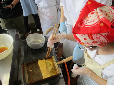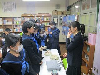〇延岡学園高等学校調理科の先生と生徒8名を講師に招き、「地域の食材を活用した弁当の試作会」を実施しました。高校生からのアドバイスをもらいながら、生徒は慣れない手つきで、みかんゼリー・ひじきとキャベツのサラダ・アジフライ&キャベツサンド・鯵味噌サンドを作りました。色とりどりでとてもおいしくできました。地元をアピールする弁当になったと思います。お礼に「貝殻ストラップ」お渡しすると、とても喜んでもらいました。高校生から手作りの「シホンケーキ」を頂き、生徒は驚いた様子ですが、とても感動していました。