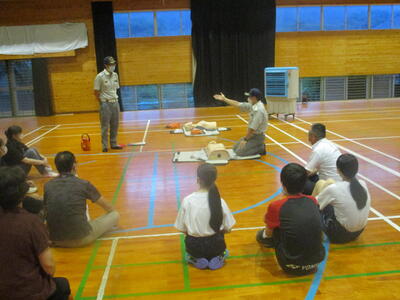 〇延岡市消防署警防課警防係の方を講師に招き、熊野江小学校・南浦中学校合同で、「親子救急法」を行いました。心肺蘇生やAEDの使用方法を細かく確認しながらの研修でした。生徒は、保護者と一緒でしたので、初めは恥ずかしがり大きな声がでませんでしたが、繰り返しの訓練で、大きな声で的確な指示と、心肺蘇生とAEDを使用ができるようになってきました。
