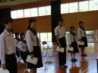 〇第74回延岡市中学校体育大会バドミントン競技選手推戴式を行いました。生徒が中心となった予行練習では、緊張の様子が表れていました。推戴式当日は、1年生は「初めての大会で緊張します。」2年生は「今までの練習の結果を出したいです。」3年生は「悔いの残らないよう全力で競技します。」など全選手が意気込みを述べてくれました。選手宣誓では、これまで支えてくれた、保護者や地域の方々への感謝の言葉もあり、感動しました。全力で競技してくれるものと思います。