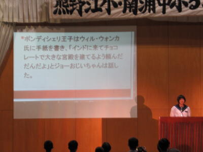 〇熊野江小・南浦中合同ふるさと祭りを行いました。和太鼓から始まり、英語暗唱弁論・小学校音楽発表・中学校リサーチ発表・中学校合唱合奏・中学校ビブリオバトル・小学校創立150周年記念発表と工夫を凝らした内容でした。また、展示も内容も素晴らしく、特に校長先生のジオラマ(若戸大橋)は参観者の目を引くものでした。閉会後は、参観の記念として、小学校作成の「しおり」・中学校作「絵はがき」をプレゼントしました。