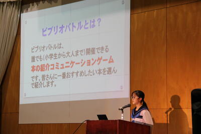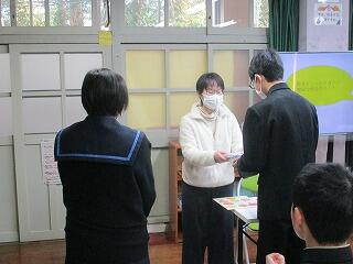〇北浦町学校給食センター・栄養教諭の方をお招きして、給食感謝集会を行いました。クイズ形式で、栄養の取り方などもわかりやすく講話を行っていただきました。生徒は、自身の食生活を見直し、給食に携わる方々や家族の思いを理解し、感謝の気持ちを持って食事ができることを改めて感じていました。集会後に感謝の色紙、ストラップ、絵はがきをお渡しました。
