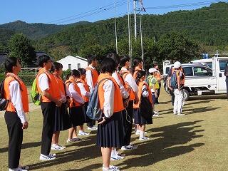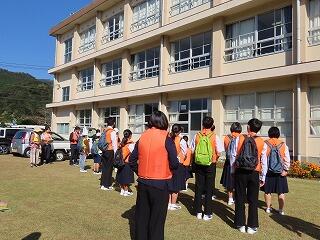 〇県民一斉防災訓練「みやざきシェイクアウト」にあわせて、小・中・地区合同避難訓練を実施しました。緊急地震速報後、小・中生徒、職員、地区の方々が熊野江小学校運動場に移動し、その後、小学校の屋上へ避難しました。とても素早い行動でした。屋上では延岡市危機管理室の方より、危難場所の確認や必要な物の準備、地震解除ボックス等の話があり、参加者全員が真剣に話を聞いていました。