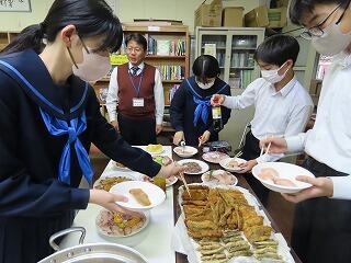〇地域の方3名を講師に迎え「魚さばき体験学習」を行いました。また、ブリ・アジも、地域の方から提供を頂きました。生徒は、講師の指導の下、熱心に調理を行い、調理後はたくさんの料理を全員でおいしく頂きました。この体験を通して、地域に支えられていることへの感謝の心や、南浦地区の素晴らしさを感じたようでした。