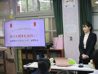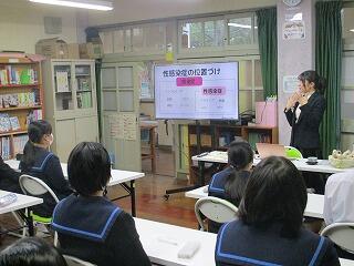 〇ママズウイング代表・助産師の方を講師に招き、「自分も大切に相手も大切に」の演題で、性に関する授業を行いました。妊娠や人工中絶・性感染症などをスライドを用いて説明していただき、「命の尊さや大切さ」も考える内容でした。講話の最後に、「未来の自分のためにたくさんの命がつながって、今の自分がある。健康な体と心をつくって次につながる。自分を大切にしよう」と話されました。生徒も職員も真剣に聞きながら大切なことを学んだ授業でした。