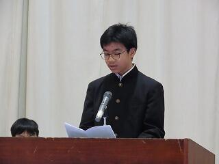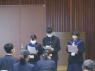 〇第3学期始業式を行いました。各学年の代表生徒が、「生活習慣を規則正しくして、学習の充実を図る」「忘れ物をせず、休み時間の過ごし方を考え、早寝早起き、学習の充実を行う」「切り替えを早くし、思い出をたくさん作り、受験に向けて頑張りたい」という内容を発表してくれました。3学期に向けての素晴らしい内容でした。校歌斉唱も大きな声でしっかりと歌っていました。