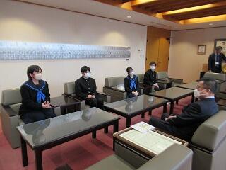 〇校長と生徒会代表4名で、トム・ソーヤ企画コンテスト優秀賞受賞の報告のため、延岡市長表敬訪問をいたしました。代表生徒はとても緊張していましたが、市長、教育長に今回の受賞について、これまでの取り組みについて、しっかり報告できました。今後も地域の良さや魅力を発信していくことで地域の活性化を図っていきたいと思います。