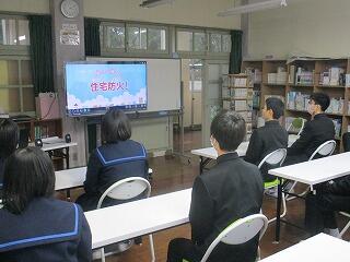〇火災による避難訓練を行いました。2階理科室を火災元と想定した訓練でした。火災発生の通報から避難場所(当日は雨天でしたので、体育館への移動)までは、さすが迅速に行動できました。その後、消防署からお借りした「火災対策」のDVDを視聴しました。火災の原因やその対処法を学習するとともに、学校以外で火災や地震などの災害が起こった時の行動を再度考えるよい機会となりました。