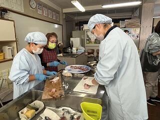 〇地域の方3名を講師に迎え「魚さばき体験学習」を行いました。また、ブリ・アジも、地域の方から提供を頂きました。生徒は、講師の指導の下、熱心に調理を行い、調理後はたくさんの料理を全員でおいしく頂きました。この体験を通して、地域に支えられていることへの感謝の心や、南浦地区の素晴らしさを感じたようでした。