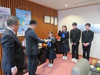 〇校長と生徒会代表4名で、トム・ソーヤ企画コンテスト優秀賞受賞の報告のため、延岡市長表敬訪問をいたしました。代表生徒はとても緊張していましたが、市長、教育長に今回の受賞について、これまでの取り組みについて、しっかり報告できました。今後も地域の良さや魅力を発信していくことで地域の活性化を図っていきたいと思います。